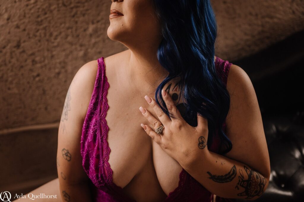 I was afraid my outfits wouldn’t fit or I would seat so much I would stink up the place with a combo of my pits and butt sweat but walking in the door I felt so relieved and felt ready to own my beauty with just getting my makeup and hair done I felt more then pampered I felt loved and worshiped which was my favorite part. Don’t get me wrong I loved every moment of my photo shoot not having to think about posing, what pose is next ayla was on top of it showing me what to do and with what I have seen other warriors do in the empowerment group I knew it was going to be great. It was great not having to think in my head what poses I should do or if I was doing it right. But hair and makeup was my favorite part I felt so connected and relaxed loved and taken care of all the reassurance helped a ton…